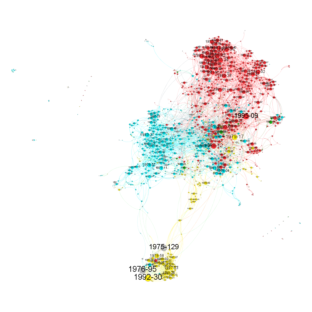 The blue nodes are candidate requests. The reds are interest group requests; and the yellows are party requests. Some gray nodes are ones I just didn’t code (usually pre-1977). Any line drawn from one to another is a citation link between the two opinions (one cited the other). Larger nodes (and labels) indicate that the opinion was cited more often by other AOs.