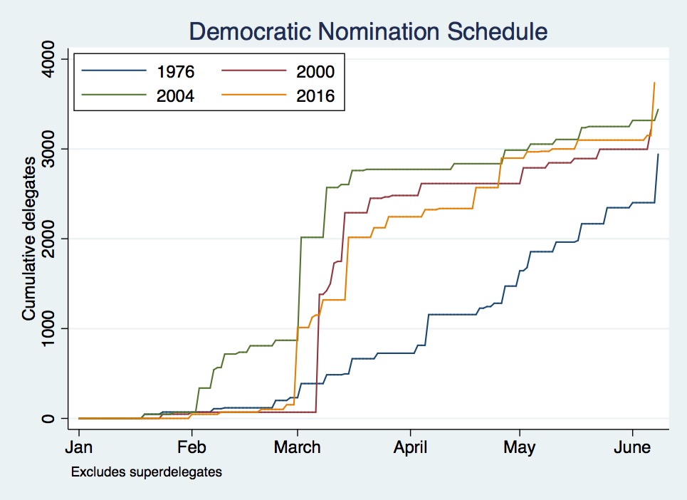 What is fascinating here is the change both from 1976 to 2000; and also from 2004 to 2016. The process this cycle is still greatly accelerated, but at a lower rate. The Democrats have moved their schedule back a bit from the relatively obscene speed of nominating Kerry in 2004.