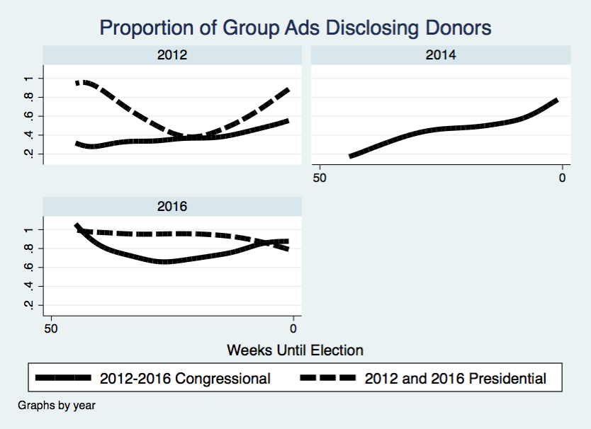 I presented some summary info on the amount of ads that aired in the 2016 election. Here is one figure from the presentation, which shows the percentage of outside group-sponsored ads by week that were from full disclosure groups. I show this for the past two presidential elections and for the last three congressional cycles. By full disclosure, I mean groups that are not considered “dark money” groups. There are a lot of great inferences in the figure, but one important inference is that “dark money” was less prevalent in 2016 than in 2014 or 2012. Lots to consider in that…