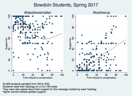 Full results for this year’s poll are forthcoming soon, but here are some initial findings. We asked students this year to assess their own political ideology on a 0 to 100 scale, with 100 being very conservative. We also asked students to assess their support for messages implied by popular Twitter #hashtags in 2016, in particular #blacklivesmatter and #lockherup. The scatter plots of ideology and support are below. The red lines show the smoothed relationship.