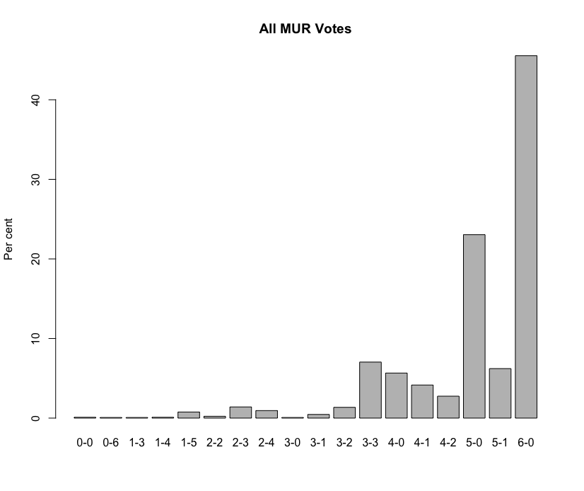 On the MUR data, where the FEC votes to proceed or to cancel an investigation into proposed wrong-doing in areas of campaign finance, the distribution of votes–which date back to around 1998 (with earlier votes somewhat harder to track)–looks like the below graph. There are 6 commissioners and the modal vote is unanimity. This is not news to those that study this, but the data are a real trove in looking for partisan patterns over time and for voting relationships between pairs of Commissioners. More to come as I dig in.