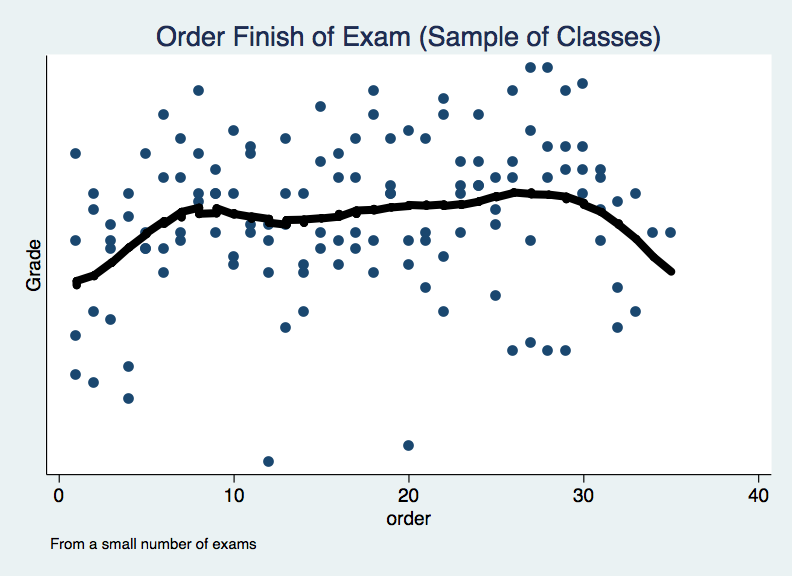 Over the years I have tried many different exam formats: the traditional in-class with blue book vs timed take-homes, for example. In some years when I’ve done the more old-fashioned in-class exam, I’ve taken to noting on the back of completed exams the order of completion (i.e., the student done first is 1 and the last student is n). For the handful of times I’ve done this, I plot below the order of completion and the exam grade (unscaled across semesters and exams).