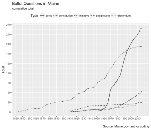 I’m giving a talk on campus on Thursday, October 4th entitled, “The Challenge of Direct Democracy: The History of Ballot Measures in Maine.” Details are here. I’ll post more about the data for the talk at a different time, but I’ve collected the statewide results for all ballot questions in Maine since 1909 (and since the early 1800s for constitutional amendments). Mainers can vote on a variety of ballot questions: bond authorizations (the most frequent in the data), constitutional amendments, citizen initiatives, legislatively referred referendums, and people’s veto measures (which veto laws passed by state legislators).