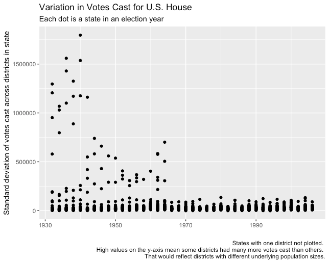 We take for granted the one-person/one-vote standard, but it was only established as a constitutional principle in the 1960s. We can see that in the below graph. The idea is to look at a state’s congressional districts over time. In a set of districts with roughly equal populations (as we have now), the only difference in the number of ballots cast across the districts in a state is variation across districts in turnout. But prior to the mid-1960s, when a number of Supreme Court decisions enshrined the one-person/one-vote standard, districts could be drawn with very different populations, including sometimes the use of at-large statewide congressional “districts.” Thus, the range (or standard deviation in this case) of votes across districts could be vast.