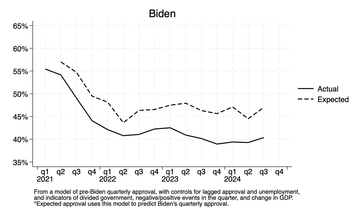 I was thinking about this given some data I collected recently on Biden’s approval rating. In The Gamble by John Sides and Lynn Vavreck, they run a statistical model predicting quarterly presidential approval and compare the “predicted” approval rating of Barack Obama to the “actual” approval rating for each quarter of President Obama’s first term (Figure 2.4 in the book), finding that Obama had slightly higher approval ratings than the model predicted. He was, in that sense, “more popular” than the model expected, albeit by a small amount. John Sides shared the data with me, and I updated the data to include the Trump and Biden years. Using a model of presidential approval pre-Biden, I created a similar comparison, shown below.
