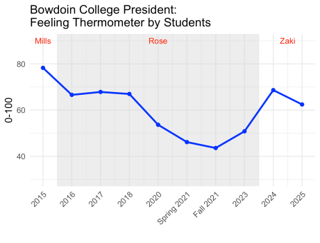 In my Bowdoin student surveys for Gov 2080 (Quantitative Analysis in Political Science), we have regularly asked students to complete a feeling thermometer question about the President of Bowdoin. The question is: