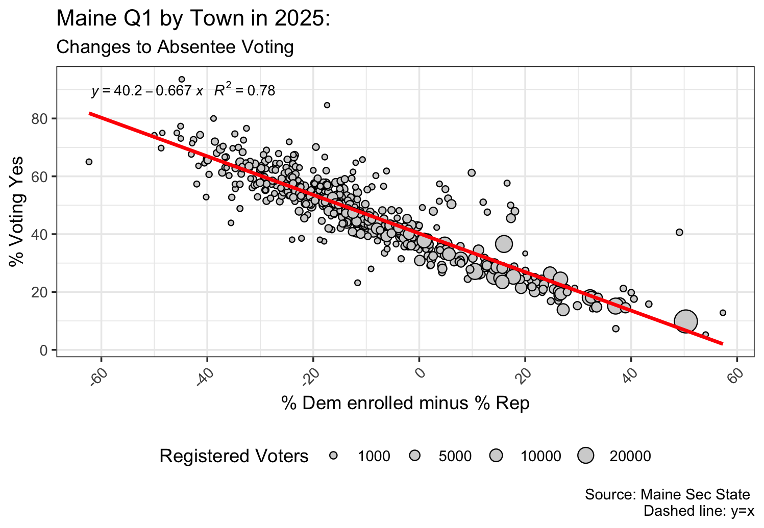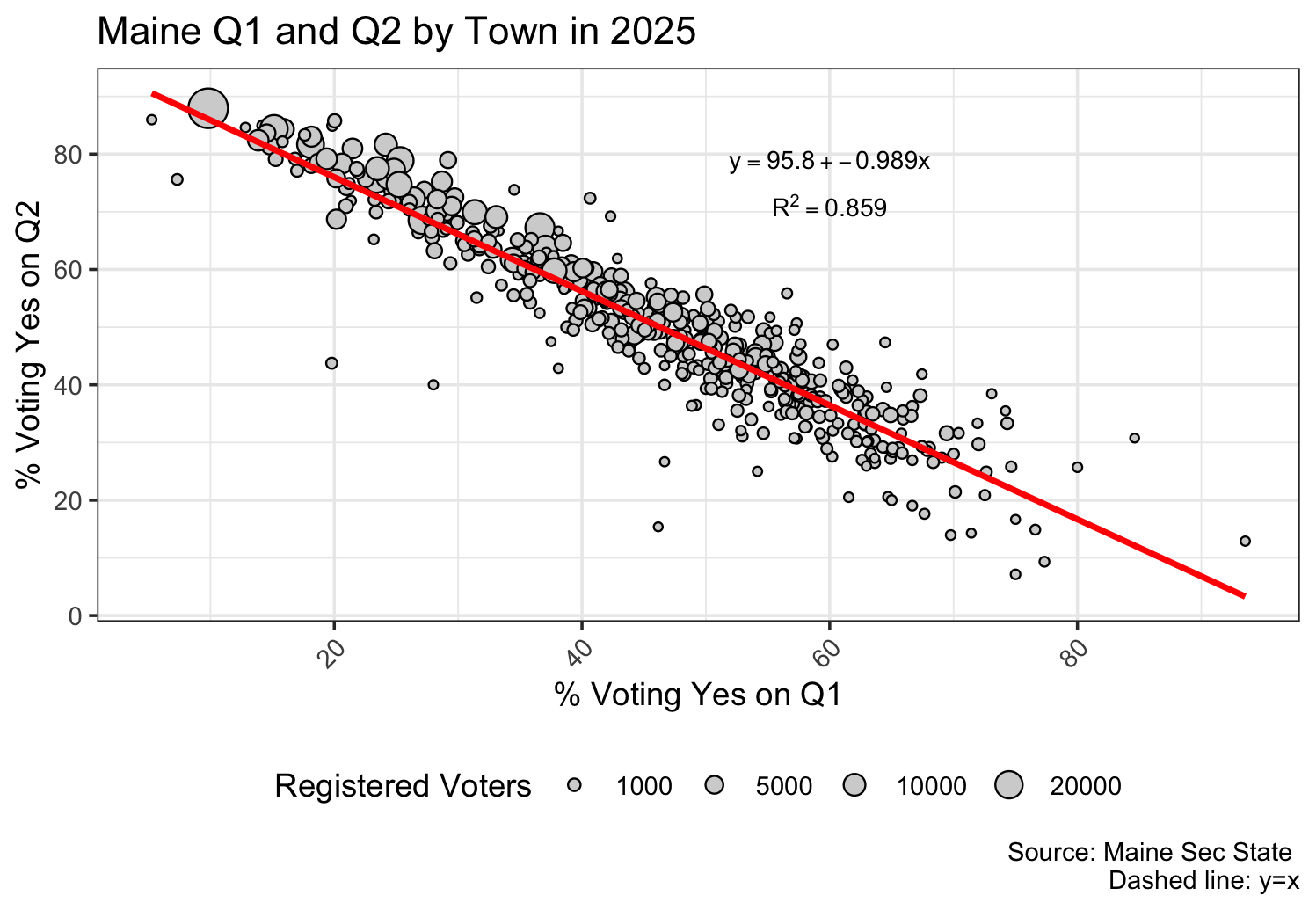 In November 2025, Maine voters weighed in on two ballot measures: Q1 asked about restrictions to voting, including changes in access to absentee ballots; Q2 asked about a red flag law for gun access. Q1 failed, with 64 percent of voters opposing it. Q2 passed with 63 percent of the vote. In the partisan world we currently live in, both ballot measures were infused with partisan angles. Democrats strongly endorse expansive voting access and also approve of more gun laws. Republicans tend to take the opposite perspective. One question, then, is whether the partisan composition of different cities and towns in Maine was strongly related to the way voters cast ballots in 2025. In one sense, this seems obvious. But in another sense, Maine voters have historically endorsed more options to vote than less. When Republican legislators in the Maine government over-turned same-day registration in 2011, for example, voters promptly restored that option in 2012. So it may not be obvious that more Republican towns would endorse Q1 in 2025. It may also be the case that concerns about gun violence (especially after the Lewiston shootings in 2023) cut through the partisan frames in Maine.